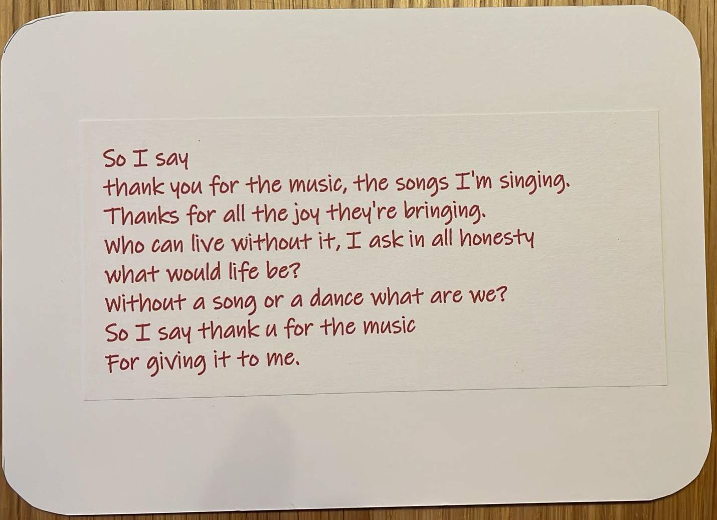 "Who can live without it, I ask in all honesty, what would life be? Without a song or a dance what are we? So I say thank you for the music, for giving it to me!"